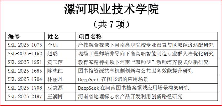 近日,河南省社会科学界联合会公布 2025 年度调研课题立项结果,漯河职业技术学院共有 7 项课题成功获批立项。此次立项成果涵盖职业教育发展、地方文化传承、数字思政建设、图书资源服务、农产品开发等多个关键领域,充分展现了学校在社会科学研究领域的扎实基础与创新活力,是学院贯彻落实河南省“十大战略”中“创新驱动、科教兴省、人才强省战略”的又一成果,彰显了高职院校服务区域发展的科研担当。