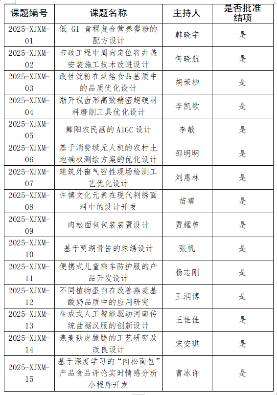 根据漯河职业技术学院《关于开展2025年校级科研项目申报工作的通知》要求,学校学术委员会在听取各项目负责人现场PPT汇报及实物展示的基础上,通过集中评议的形式,对2025年度立项的校级科研项目进行了结项评审评定。现将相关结果予以公示。公示期为:2025年11月28日至12月2日。公示期内,如有异议,请以书面形式向学校科研处(办公楼416)反映。电话:03955983567。