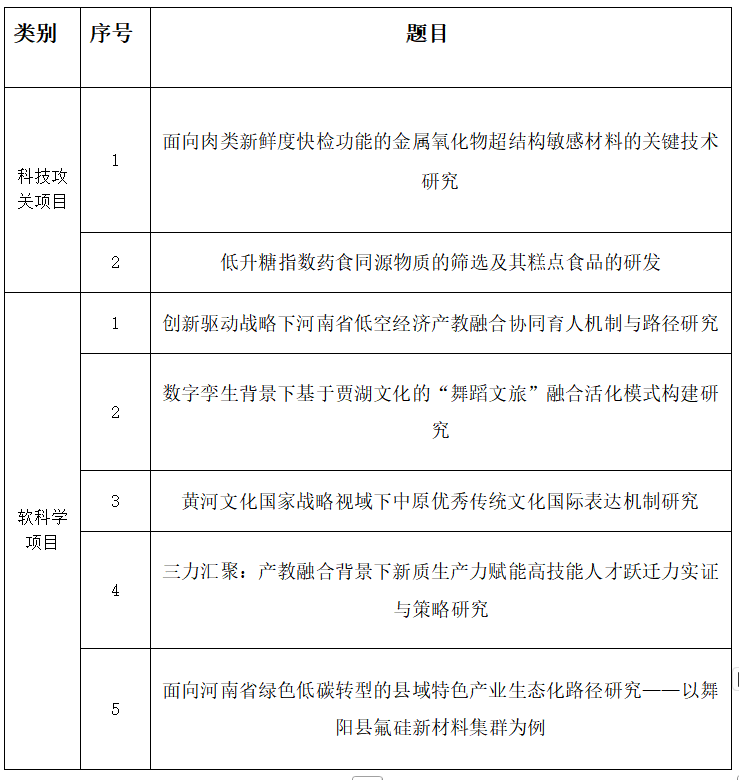 根据《河南省科学技术厅河南省财政厅关于组织申报2026年度省科技攻关项目的通知》(豫科项〔2025〕39号)和《河南省科学技术厅河南省财政厅关于组织申报2026年度软科学研究计划项目的通知》(豫科〔2025〕108号)的相关要求,经个人申报、学校审核、校学术委员会专家评审,现将拟推荐申报的项目予以公示。公示期为:2025年10月14日至10月18日。公示期内,如有异议,请以书面形式向学校科研处(办公楼417)反映。电话:03955983567。