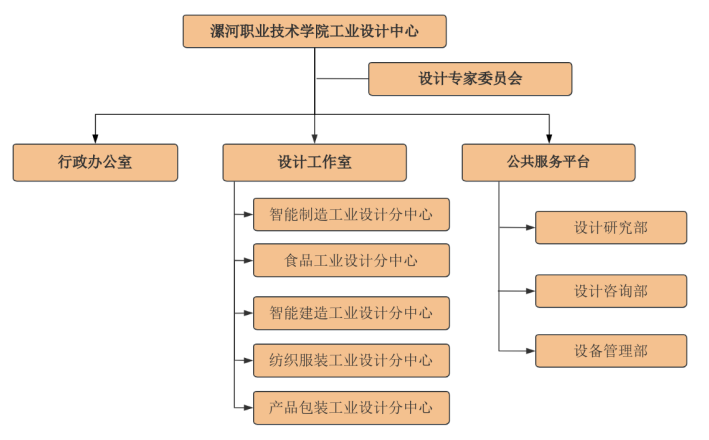 漯河职业技术学院工业设计中心是由河南省工业和信息化厅于2024年认定的省级工业设计中心。中心依托漯河职业技术学院智能制造学院、食品技术创新学院、建筑工程学院、服装设计学院、艺术学院等具有设计能力的院系开展建设,整合了各院系优势专业建立的跨学科工业设计科研与实践平台。中心实行主任负责制,下设设计专家委员会,负责中心发展战略愿景规划和学术和支持。具体运营由工业设计分中心、公共服务平台和行政办公室组成。公共服务平台承担基础研究、设计咨询和设计设备等基础性软硬件支持;工业设计分中心下设智能制造工业设计分中心、食品工业设计分中心、智能建造工业设计分中心、纺织服装工业设计分中心、产品包装工业设计分中心等五个设计分支机构,充分发挥高职院校服务地方经济的能力,面向企业开展工业设计服务,中心整体架构如下图所示。